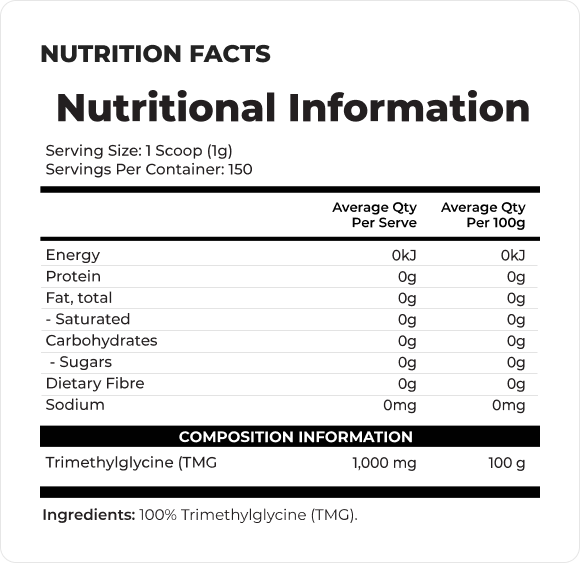 Zero fillers. Zero colours. Zero sweeteners. TMG in its purest form clean, reliable, and ready to stack with any performance or daily wellness routine.